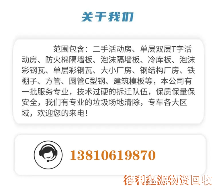 提供彩鋼房、活動房等回收拆除服務,涵蓋廢舊設備、金屬、工業(yè)設備、電力設備、制冷設備、鋼結構等。服務范圍覆蓋北京多區(qū)及周邊,可承包大跨度廠房等廢舊資產回收。